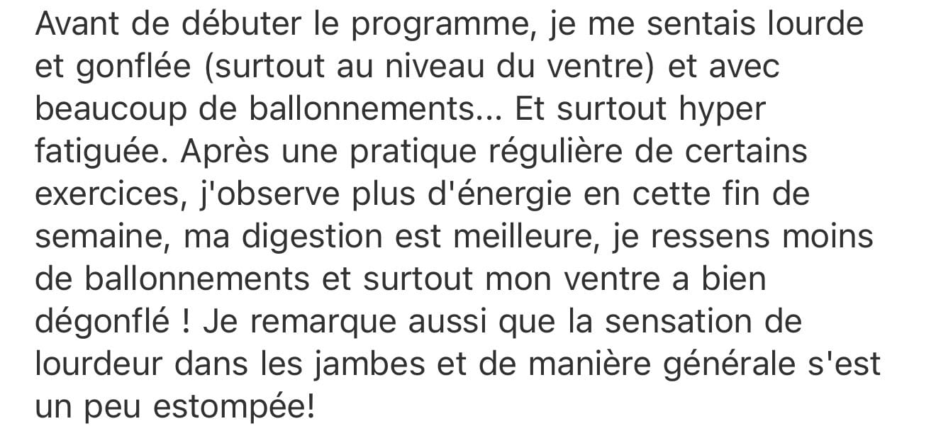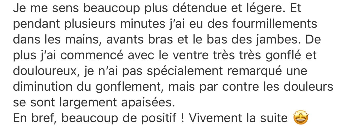 "J'ai commencé avec le ventre très gonflé et douloureux. Le gonflement n'a pas changé tout de suite, mais la douleur, elle, s'est vraiment apaisée"